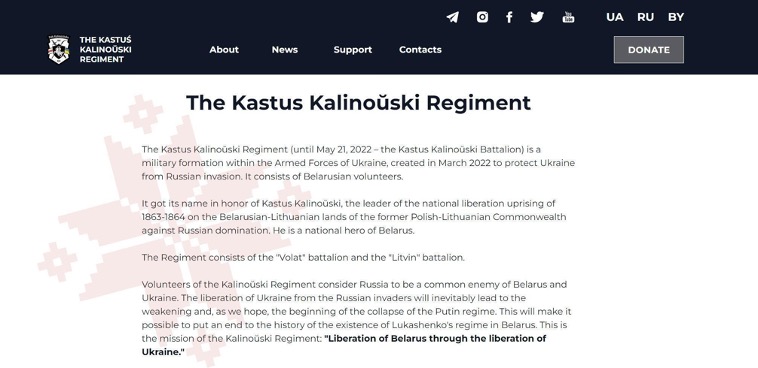 Also active since 2014, Belarusian volunteers are split between a series of battalions. The largest, estimated in 2022 to compose 300 volunteers, is the Kastus Kalinouski Regiment (KKR). Like other Belarusian volunteers, the KKR sees the Ukraine war as part of local anti-Russian struggles against Belarusian dictator Alexander Lukashenko (a staunch Kremlin ally), as captured by the slogan ‘Liberation of Belarus through the liberation of Ukraine’. The battalion has a general vision for a democratic Belarus integrated with Europe, akin to Poland and the Baltics.